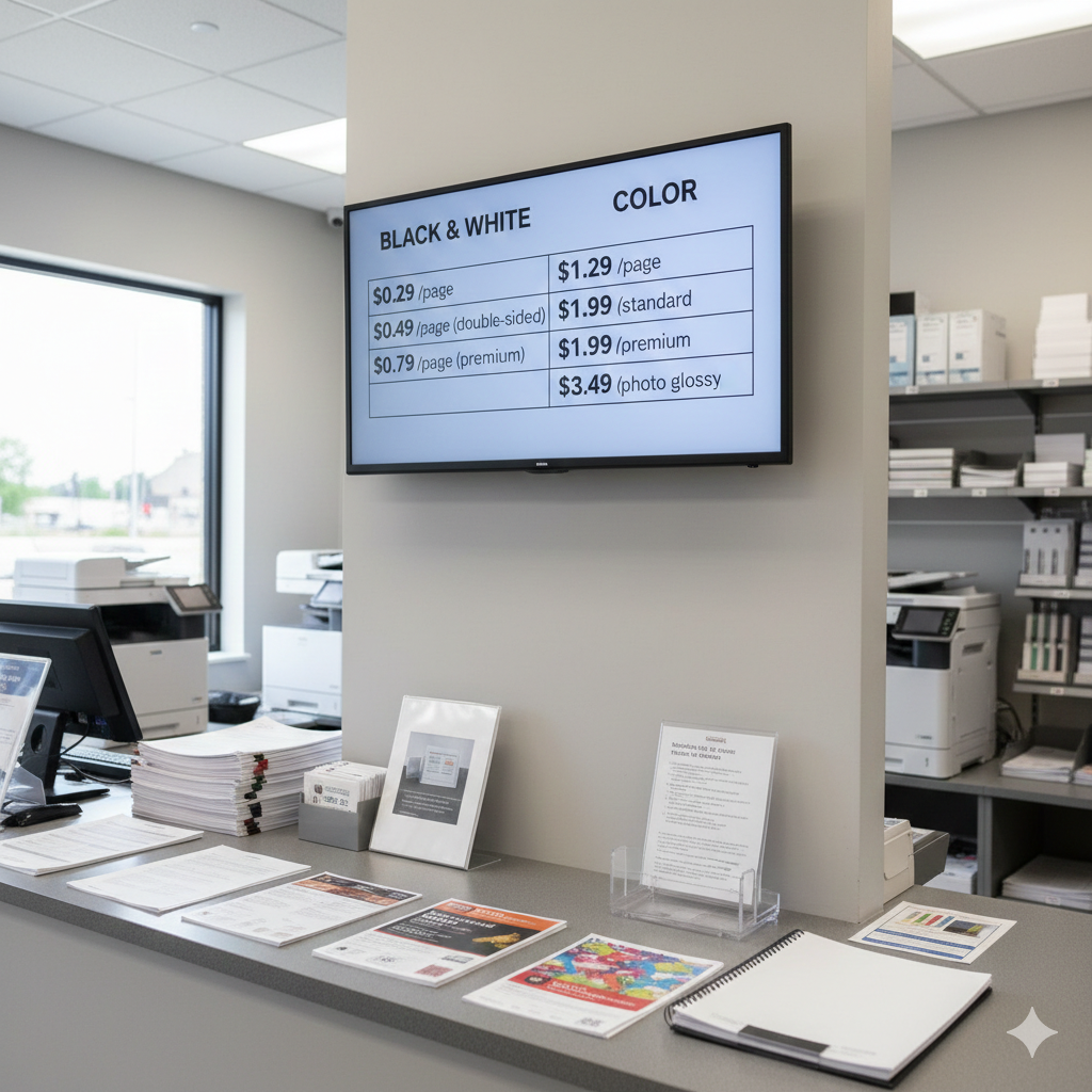 Double-sided black and white printing usually runs $0.20 to $0.25 per sheet, making it more economical for multi-page documents where you want to reduce paper usage.