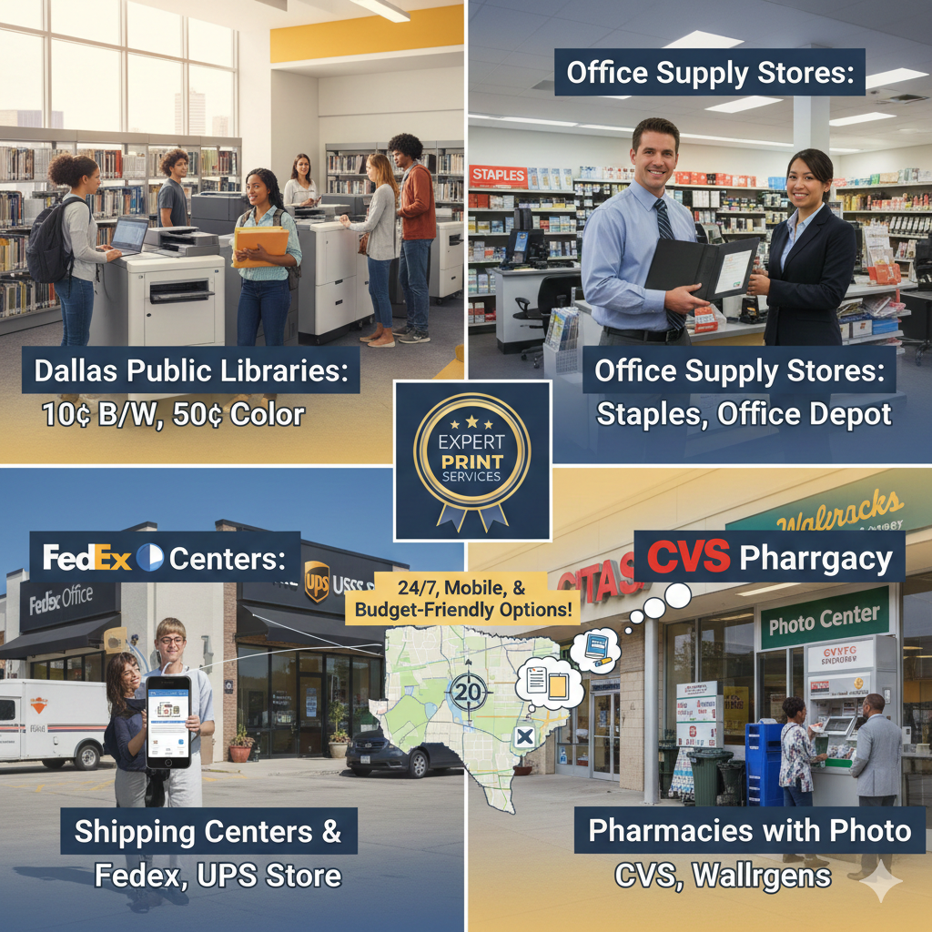 This guide reveals where Dallas residents print documents quickly and affordably. You will discover 24-hour locations, mobile printing options, and budget-friendly alternatives near you.